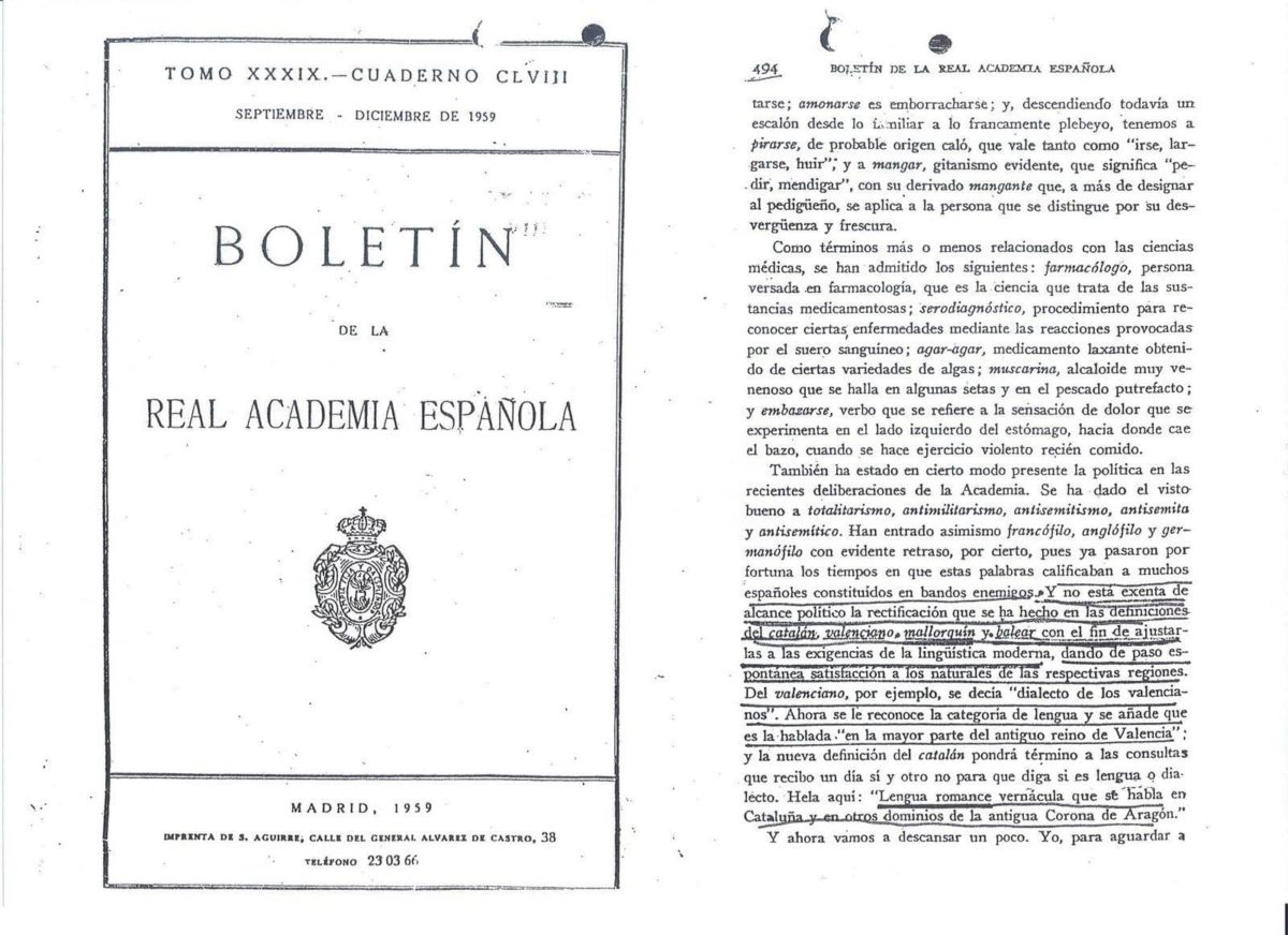 I ja per acabar, es Bolletí Oficial de sa Reial Acadèmia Espanyola de setembre-desembre de l’any 1959, tom XXXIX, publicà una resolución que deia: “Y no está exenta de alcance político la rectificación que se ha hecho en las definiciones del catalán, valenciano, mallorquín y balear con el fin de ajustarlas a las exigencias de la lingüística moderna, dando de paso espontánea satisfacción a los naturales de las respectivas regiones… y la nueva definición del catalán pondrá fin a las consultas… “lengua romance vernácula que se habla en Cataluña y en otros dominios de la antigua Corona de Aragón“.
