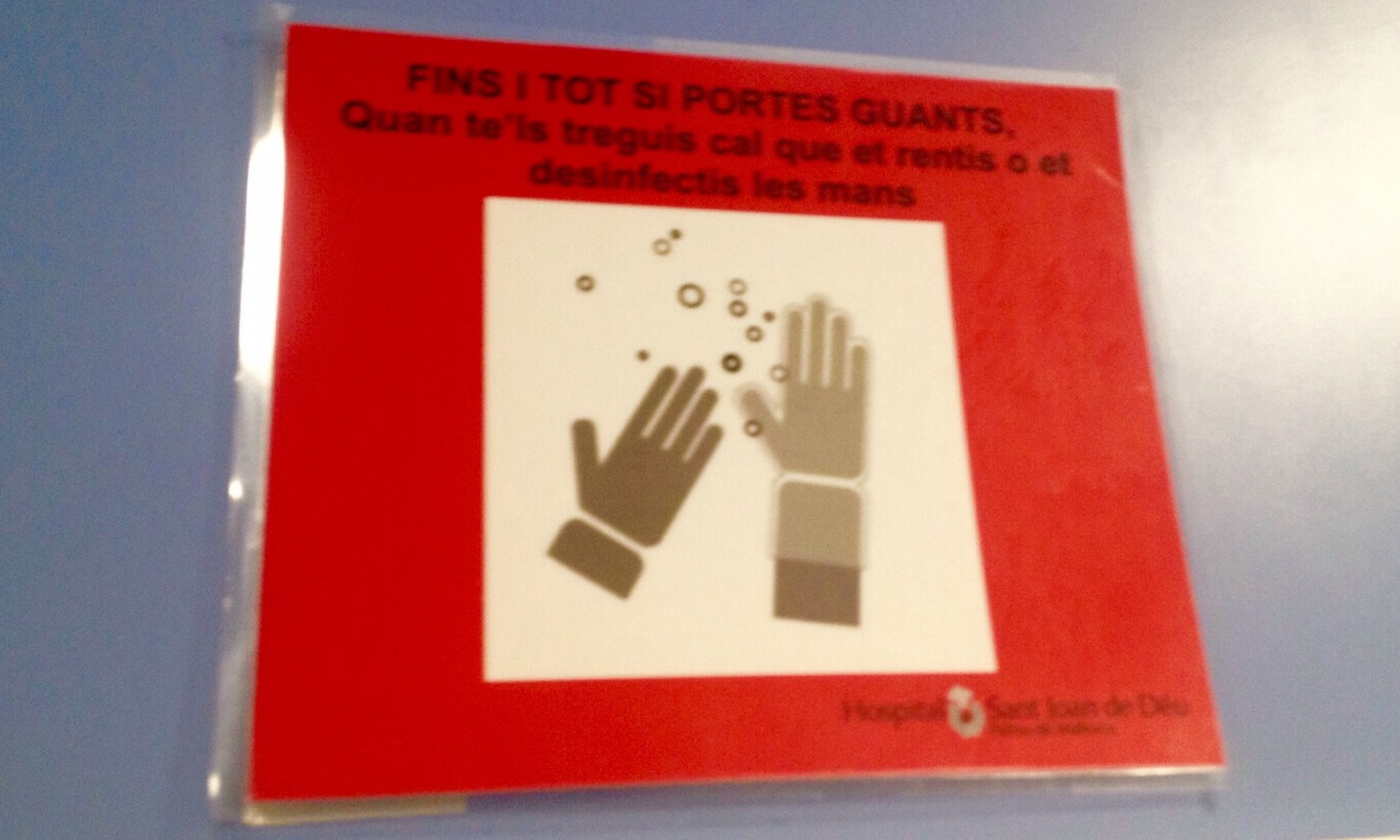 Vet aquí un cartell que hem trobat a s’Hospital de Sant Joan de Déu de Palma però que podríem trobar a la Vall d’Hebron o a s’Hospital de Sant Pau de Barcelona. Talment. Està escrit en un barceloní estricte, sense cap concessió a ses modalitats insulars que defensen es nostro Estatut i sa Llei de Normalisació lingüística (1986). Cap ni una. Barceloní de cap a peus. Efectivament, es lèxic es ben continental (portes en lloc de dus) i s’estructura sintàctica també: cal que se podria adaptar com és necessari que (o convé que). I encara que “treure-se” i “llevar-se” una peça de roba són equivalents, a Mallorca solem dir “llevar-se es guants”, no “treure-se es guants”. Morfològicament, veim també que s’empra es pronom feble “et” i sa combinació pronominal “te’ls” quan en mallorquí mos estimam més dir “te” i “els te”, es canvi d’orde des complement directe i indirecte que només feim a Mallorca i que està en desús perquè s’està perdent entre sa jovenea. Finalment, clar, s’article salat no compareix per enlloc.