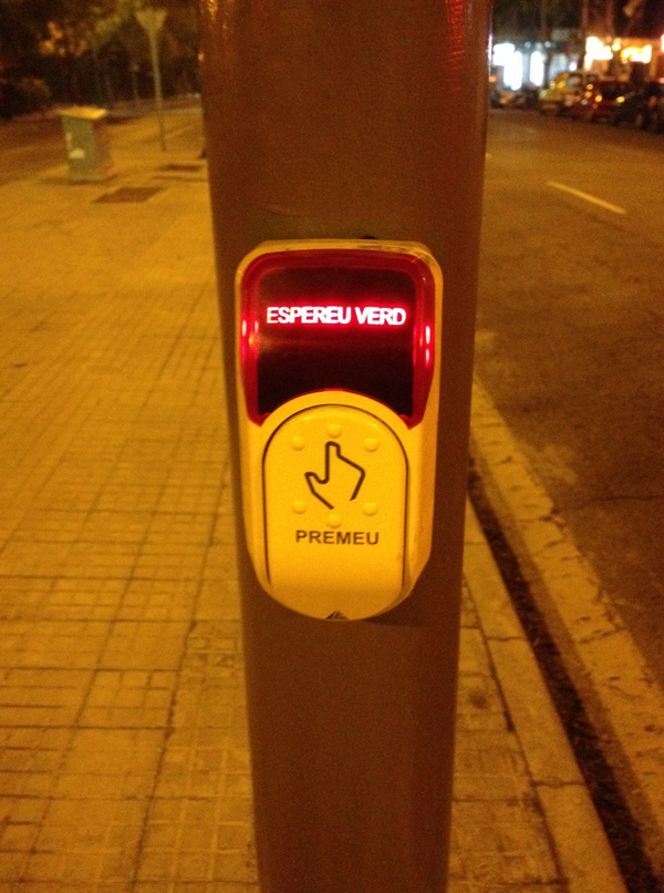“Espereu verd” és totalment inadmissible a Mallorca, hauria de ser esperau, una forma, d’altra banda, totalment normativa. Però lo que és pixar fora de test és aquest “premeu”, una fórmula que molts de mallorquins trobaran completament fora de lloc, ja que s’accepció més estesa a Mallorca de prémer és “fer esforços per anar de ventre”. A Mallorca, pitjam un botó, no “premem” un botó. De fet, segons es diccionari Alcover-Moll, prémer no té cap accepció que signifiqui “pitjar”.