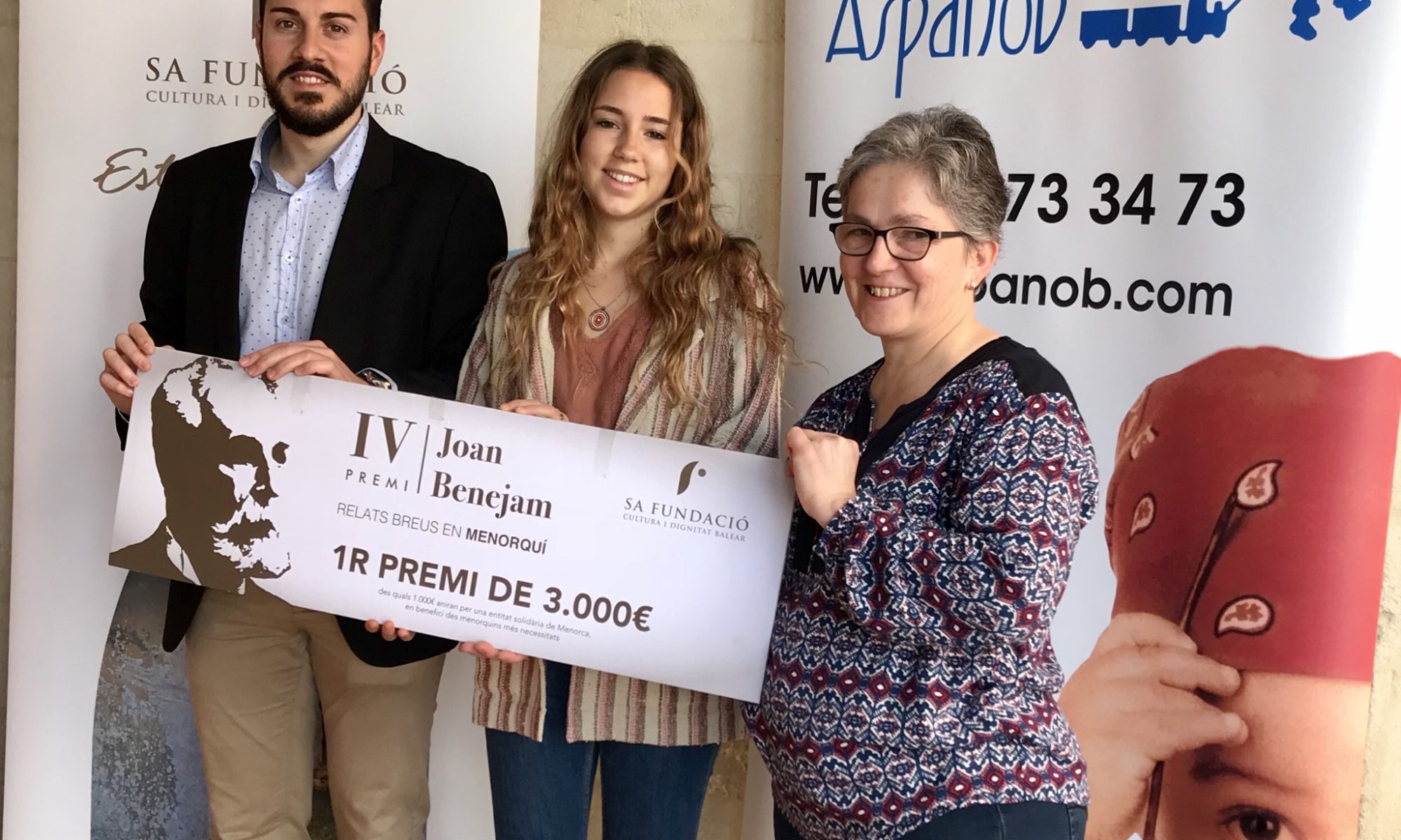 Una setmana després de sa Gala des IV Premi Joan Benejam de relats breus en menorquí, Sa Fundació comunica que ASPANOB ha estat s’entitat triada per Anaïs Faner, guanyadora de sa 4ª edició des Joan Benejam. Sa jove ciutadellenca se va alçar amb es primer premi de 3.000€, des quals 1.000€ han d’anar destinats a una entitat social de s’illa de Menorca segons ses bases des concurs.