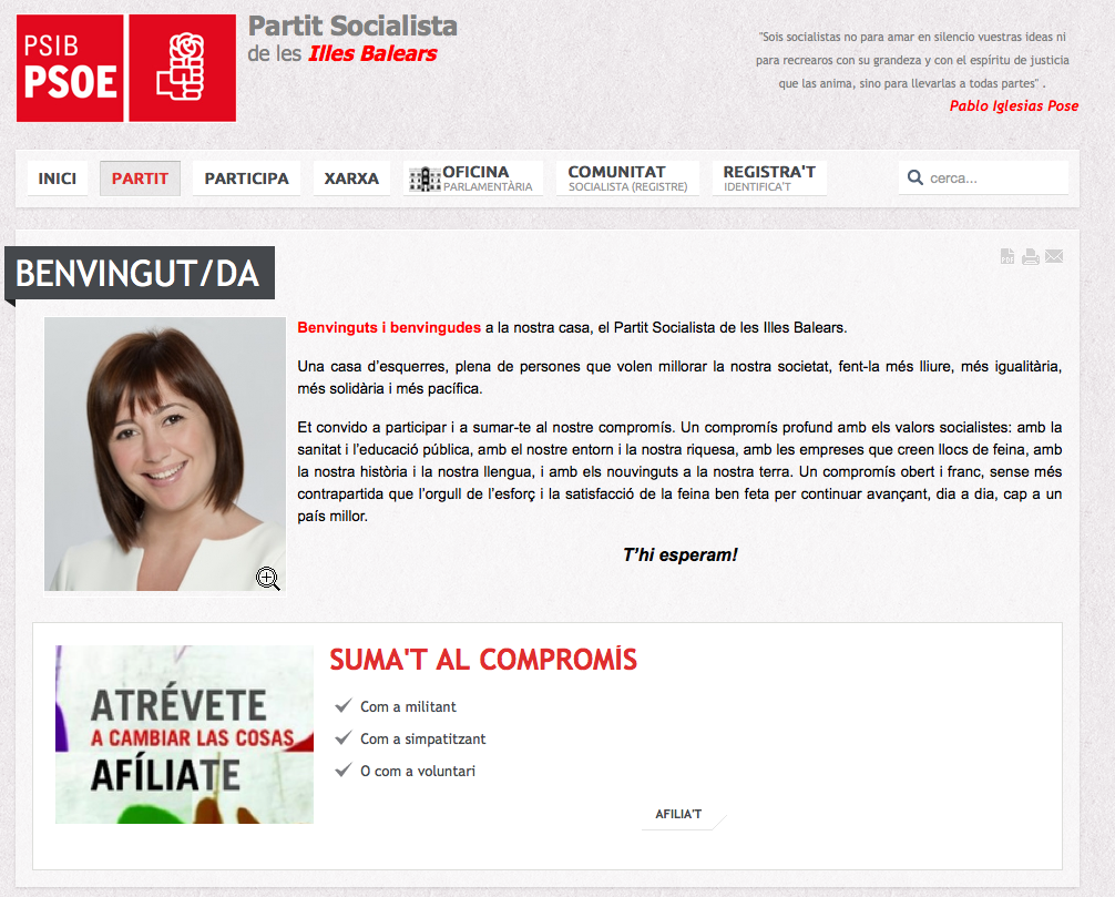 Vetaquí una altra mostra de com es nostros polítics han estat es principals agents de catalanisació a ultrança de sa nostra llengua. A Mallorca, quan volem convidar qualcú, el convidam a ca nostra, no a “casa nostra”, això per començar. Ara bé, lo que mos ve més de nou d’aquesta carta de benvenguda (no de “benvinguda”) de Na Francina Armengol és sa mescladissa entre barceloní i mallorquí, en aquest cas una de molt comuna: sa mescladissa de morfologia verbal. No mos cansarem de repetir-ho: sa morfologia verbal balear està totalment admesa per s’Institut d’Estudis Catalans, no entenem, per tant, per què no s’utilisa amb més freqüència. N’Armengol fa ús d’una forma impròpia i per tant inadmissible a Mallorca, una autèntica catalanada, “Et convido”, quan ella sempre ha dit Te convid. Però lo curiós és que a lo darrer mos amolla un T’hi esperam!, això és, sa fórmula mallorquina en lloc de sa catalana “T’hi esperem!”. O tots moros o tots cristians.
